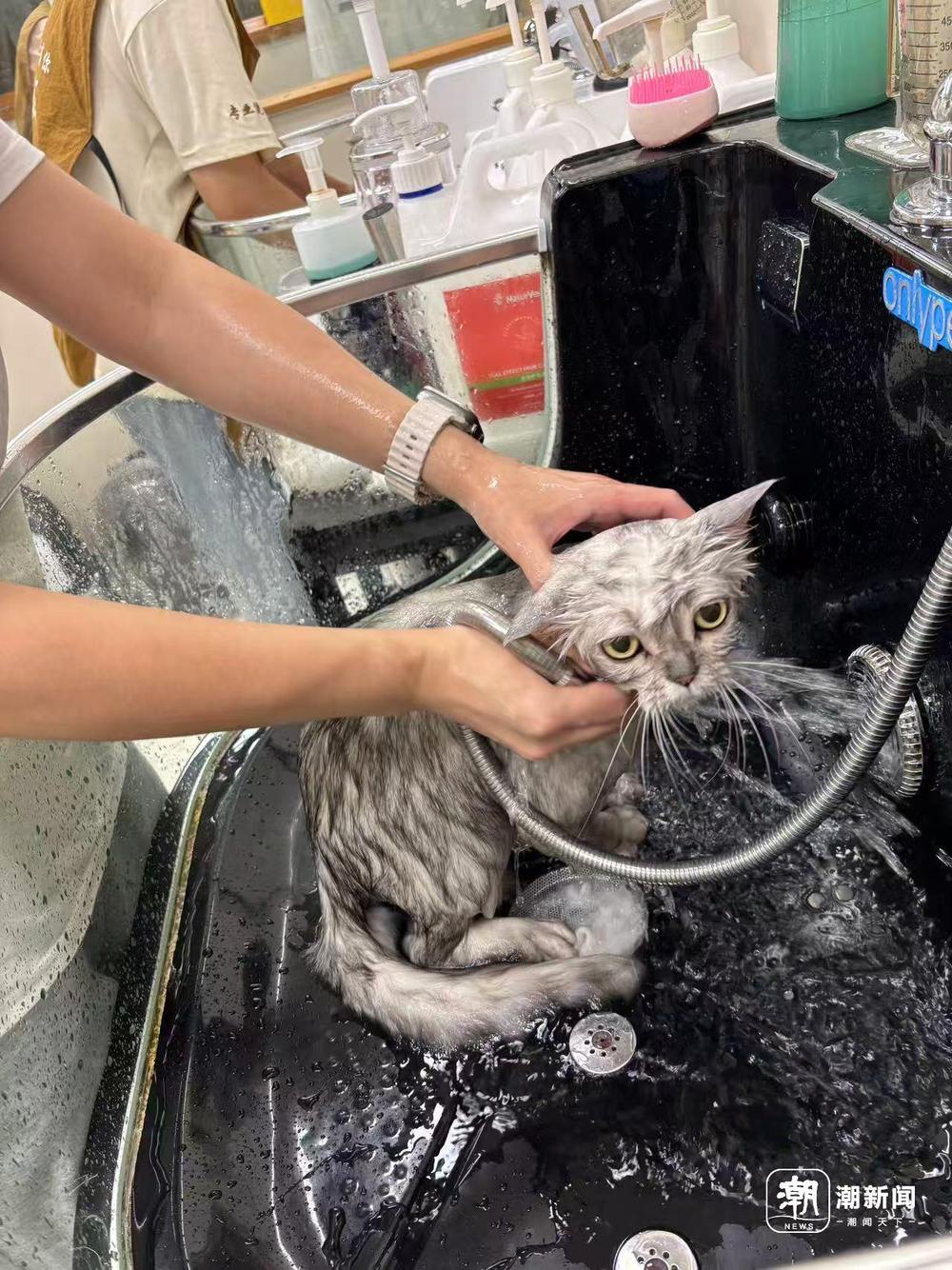 宠物店给寄养猫咪洗澡 潮新闻记者摄
