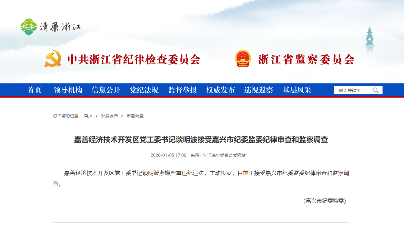 谈明波接受嘉兴市纪委监委纪律审查和监察调查(央广网发 来源:浙江省纪委省监委网站)