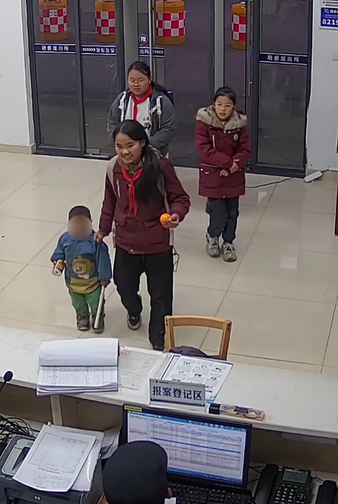 韦倩、唐万英、邹云曦领着一名2岁男孩走进派出所求助(央广网发 金东区委宣传部供图)