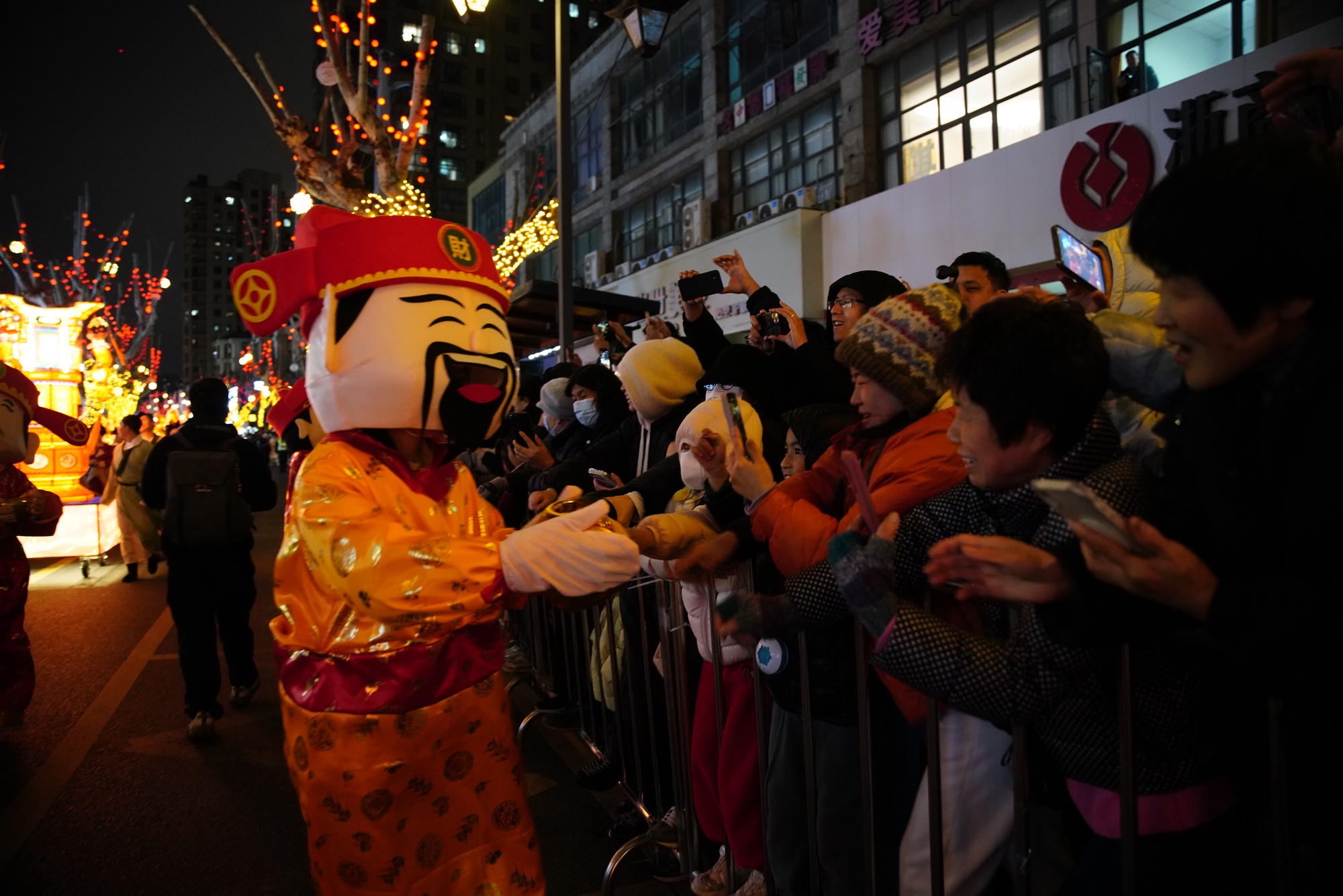 巡游沿线,人山人海、热闹非凡。“硖石灯彩是海宁的非遗,现场非常震撼,让我印象深刻。”游客邓宏杰最喜欢的是“迎财神聚宝盆”,“现场还和财神打了招呼,非常开心。”