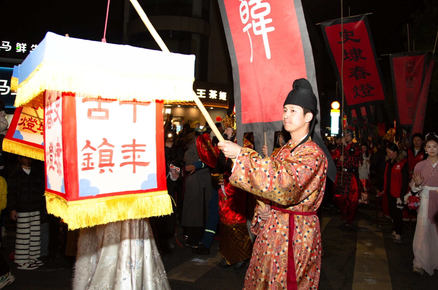 演出围绕宋韵文化展开,以宋词、歌舞等描绘元宵节的热闹景象,逐步升华至家国情怀,热切展望2026年新方向、新发展。开场歌曲联唱《珊瑚颂》《恭喜发财》等迅速点燃现场氛围;随后是亮灯仪式,在舞蹈演员手持灯笼的簇拥下,启动“滚灯”装置点亮全场,并通过视频连线与分会场踩街队伍同步启动亮灯仪式。现场发布了临平区首批“三带十街区”新时代文明实践阵地及“临礼好市”促消费品牌,打通服务群众“最后一公里”,展现精神文明建设与文旅经济融合新成果。