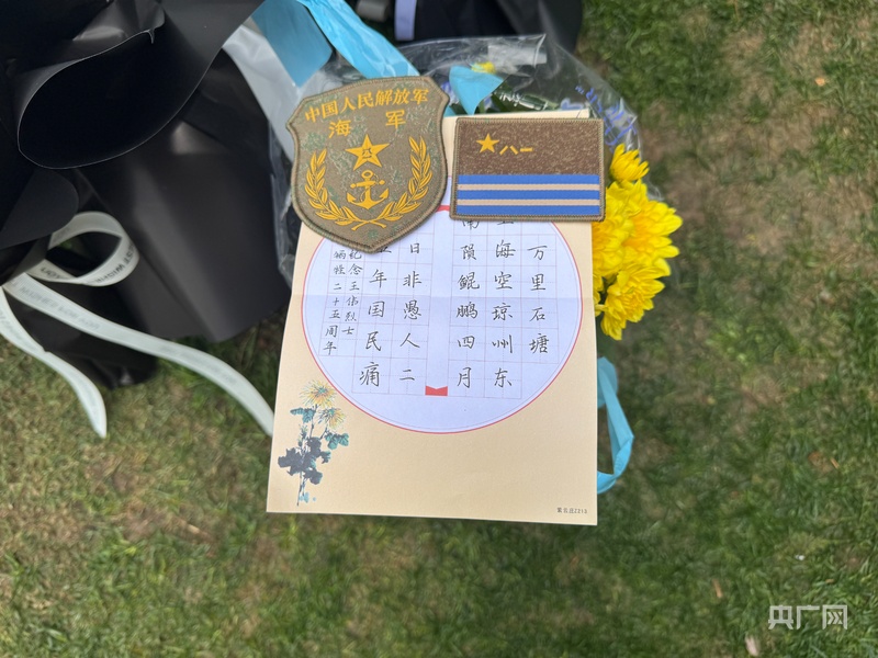 从四川泸州专程赶来的高二学生周同学,带来了自己用书法抄写的诗歌,还有一枚海军臂章和一枚军旗章。“这些都是身边退伍老兵朋友送给我的,我带过来献给王伟烈士。他曾是海军航空兵,我想这也算是一种传承,让烈士看看当今的盛世。”
