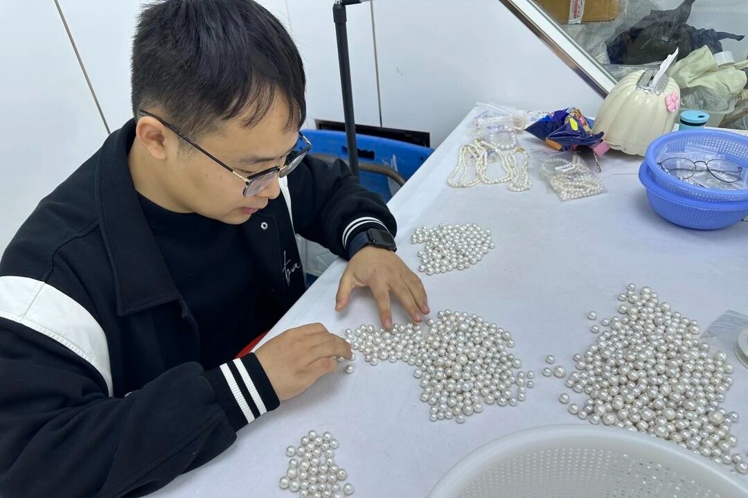 曙旺珠宝商行店主詹凌枫正在筛选珍珠(建行浙江省分行供图)