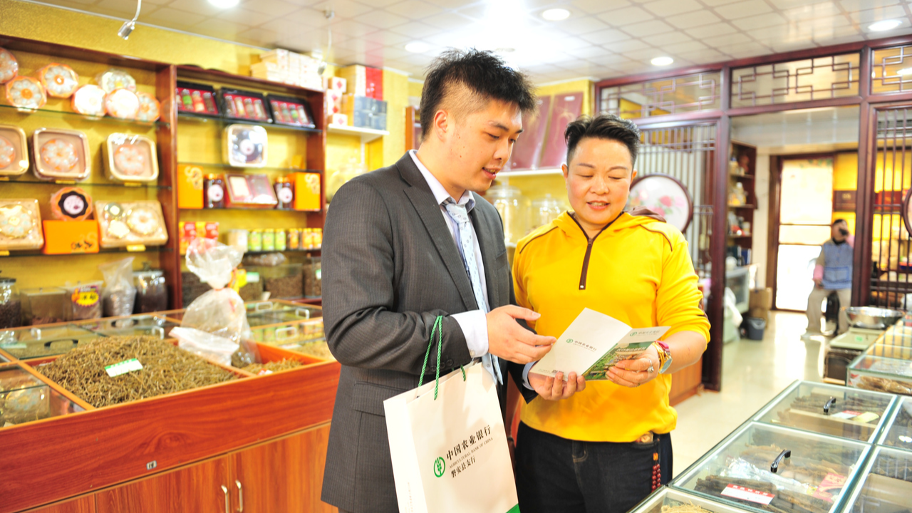 农行金华磐安县支行工作人员走访药材商户,介绍金融服务