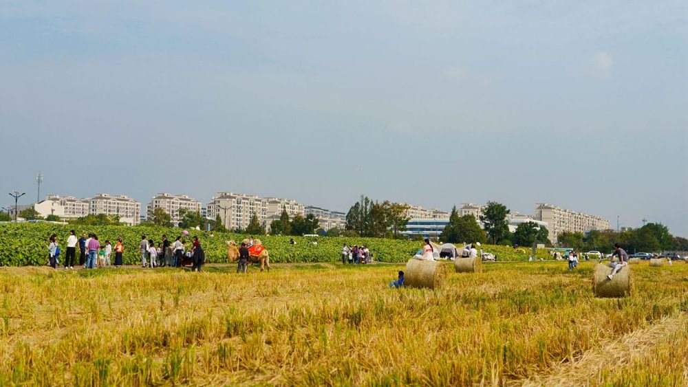 她们就在住在景区附近的小区,平时也经常来铜鉴湖花海赏花散步,“早上刚好路过,一眼看见这些草垛,就赶来拍照。”