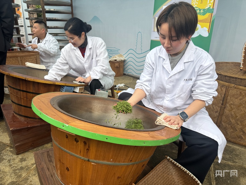 工作人员现场加工“平阳黄汤”茶(央广网记者 项楠 摄)