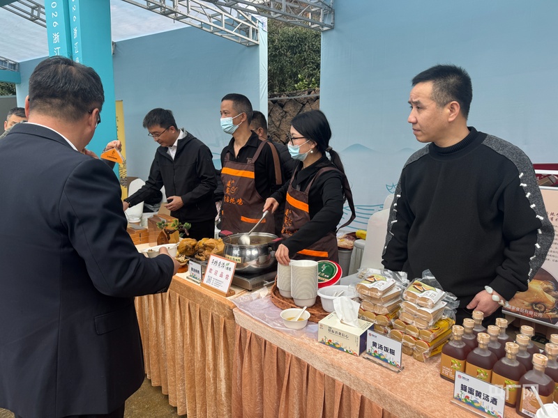 工作人员向现场观众推介品类丰富的“平阳黄汤”衍生产品(央广网记者 项楠 摄)