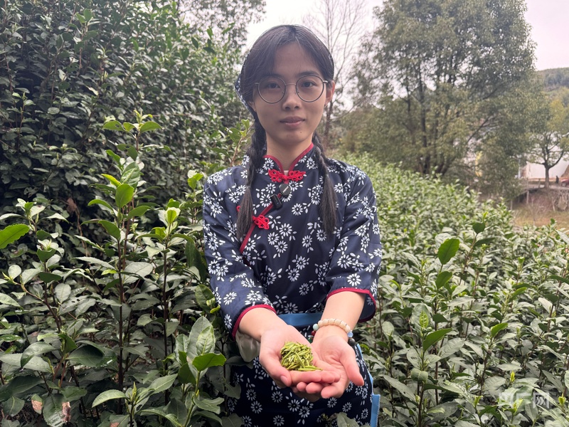 “00后”茶娘唐佳佳向记者展示初次采的绿茶嫩芽(央广网记者 项楠 摄)